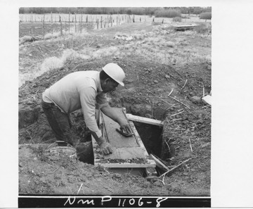 Finishing concrete headwall on one of the flumes along the ditch. This was a group project cost-shared by the ASCS and New Mexico State Engineer. Total cost of the project — $9,000.Please credit: USDA-Soil Conservation Service.